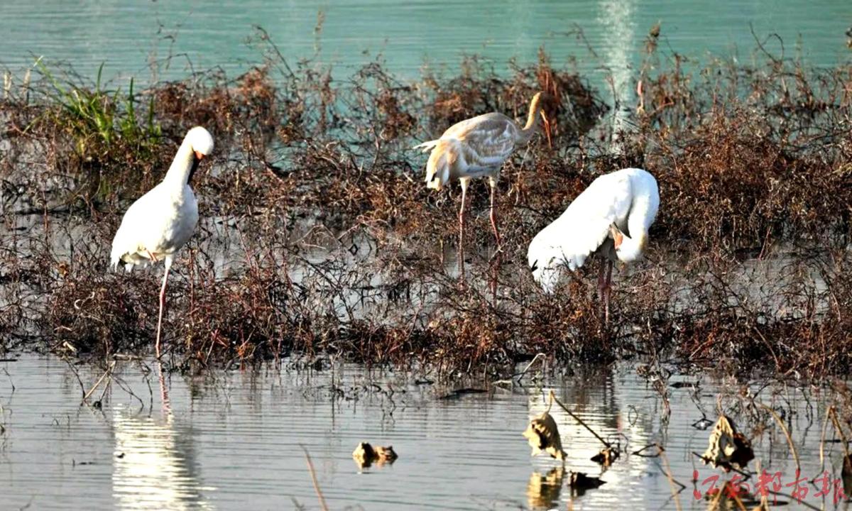 江南都市報訊 全媒體記者許南平攝影報道:12月21日,江西鄱陽湖國家級自然保護區(qū)管理局科研人員王小龍在地處中國候鳥小鎮(zhèn)的永修吳城鎮(zhèn)鄱陽湖生態(tài)濕地公園科考中,驚喜發(fā)現(xiàn)3只白鶴棲息濕地公園內(nèi)。這是鄱陽湖生態(tài)濕地公園2021年建立以來,首次監(jiān)測到野生白鶴。白鶴是世界極危物種,被列入《世界自然保護聯(lián)盟》(IUCN)極危物種。目前全球僅存4000余只,其中每年約98%在鄱陽湖越冬。白鶴棲息于開闊平原沼澤草地、苔原沼澤和大的湖泊巖邊及淺水沼澤地帶。其主要以苦草、眼子菜、苔草、荸薺等植物的莖和塊根為食,也吃水生植物的葉、嫩芽和少量蚌、螺等軟體動物、昆蟲、甲殼動物等動物性食物。白鶴是一種冬候鳥,每年六至八月在俄羅斯境內(nèi)的西伯利亞繁殖,九十月在中國東北吉林境內(nèi)的莫莫格濕地停歇一個月左右,再啟程南下至江西鄱陽湖越冬,翌年3月中下旬開始遷飛回北方。