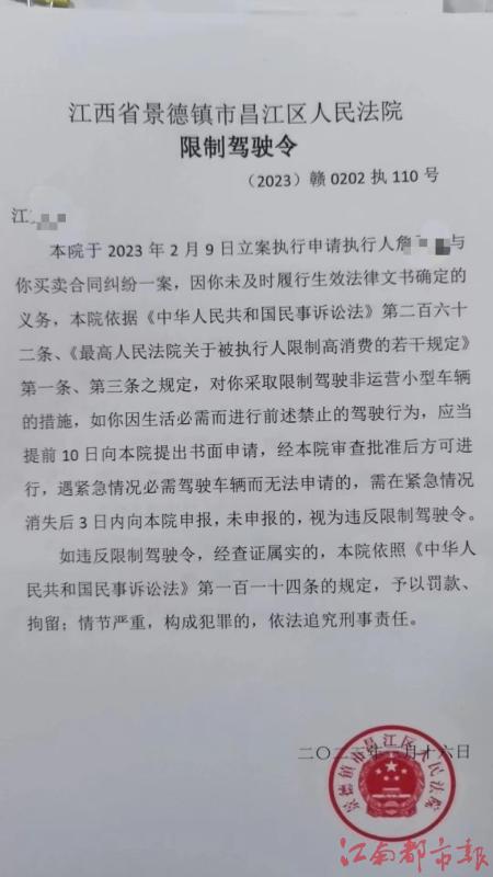 江南都市報(bào)訊 方劍、全媒體記者余文斌攝影報(bào)道:3月27日,記者從景德鎮(zhèn)市昌江區(qū)人民法院獲悉,該院于近日向江某某發(fā)出了該市首份“限駕令”,通過(guò)限制其駕駛非運(yùn)營(yíng)性小型車(chē)輛的措施,達(dá)到有力打擊“老賴(lài)”,保障其他當(dāng)事人合法權(quán)益的目的。