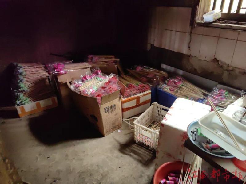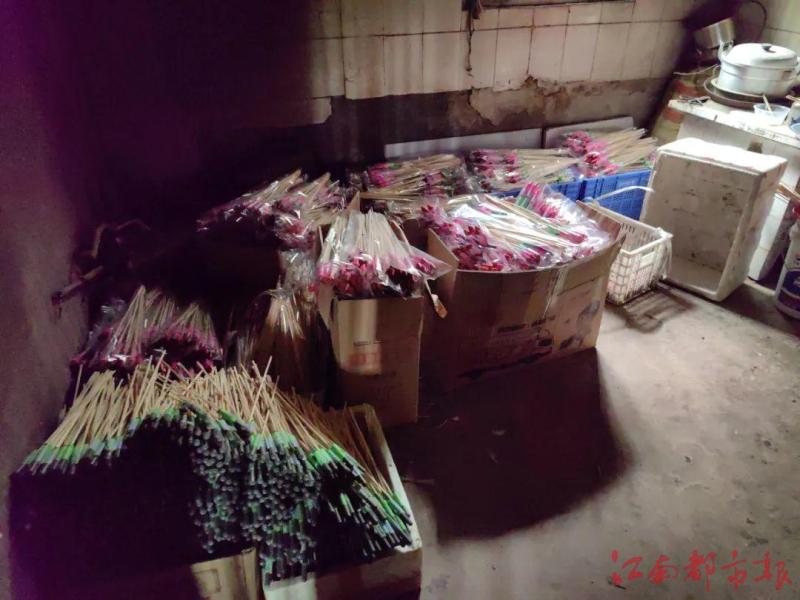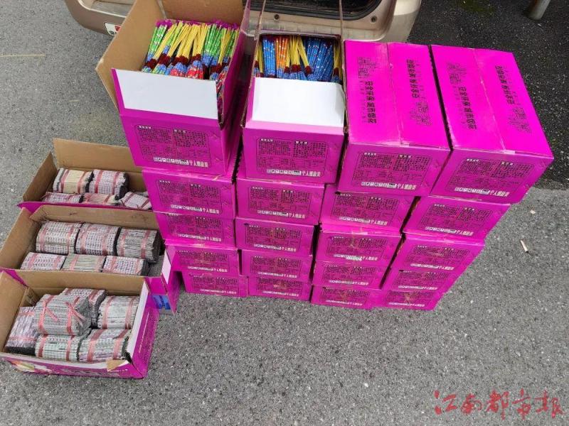 經(jīng)現(xiàn)場清點,有成品煙花9箱、袋裝煙花3袋以及煙花套筒3袋。