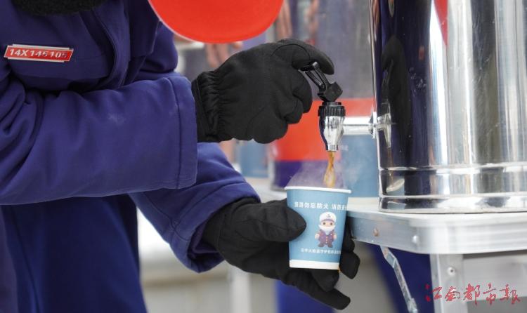 在索道志愿服務點,一杯杯紅糖姜茶傳遞到游客手上,暖胃又暖心。“我們是從北京到廬山來旅行的,今天氣溫比較低,我們在這里等索道下山,感覺非常冷。然后看到有免費姜茶,喝完之后確實是暖到心里,非常感謝廬山消防救援大隊提供的姜茶,非常開心。”一位游客說。