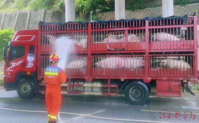 本報訊 李科、全媒體記者陳建新攝影報道:8月18日,記者從萍鄉(xiāng)消防部門獲悉,近日在萍鄉(xiāng)某高速路出口,一貨車司機向消防部門求助:其所運輸生豬的車輛,由于車廂密閉的空間內(nèi)溫度急劇攀升,40余頭“二師兄”出現(xiàn)明顯的虛弱、癱倒等中暑癥狀,情況十分緊急。